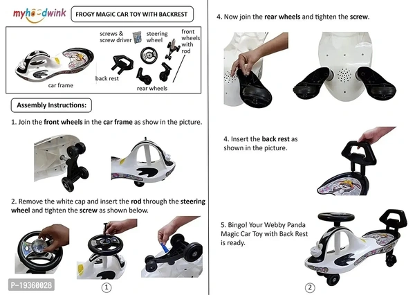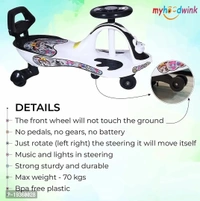 Smooth, quiet and simple to ride for your toddler or young child. Frody Car offers effortless operation with no gears, batteries or pedals. Simply just twist, wiggle, and go! Also comes with fire truck themed decals, that your future little firefighter will surely love All you need is a smooth, flat surface. Prefect for both outdoor AND indoor playing. Great way to keep kids active and moving Myhoodwink makes kids toys that are not only fun but safe. All toys are safety tested, free of banned phthalates, and provides healthy exercise and plenty of fun! Made from rugged high-quality plastics Ride on Frogy Car is completely washable and easy to clean. Usage should always be under direct supervision of an adult. Measures: 30 x 13.5 x 16 inches. Batteries required 2X1.5V AA Type( Not included) Ideal for 2 to 8 years Note - Front Small Wheel will not touch the ground/surface. This is the feature of this toy, when the kid rotates the steering left and right then it starts to move itself.