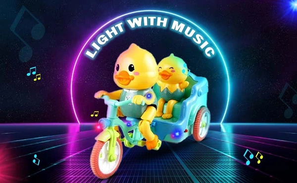 - Your little one will be captivated by the playful lights and cheerful tunes as the duck pedals along on its mini tricycle/rickshaw.